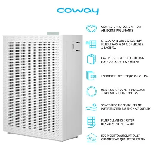 The Coway HEPA Filter Technology Air Purifier which comes with a coverage area of 355 Sq. Ft. It is equipped with Cartridge Type Filter Design, 4-Stage Speed control, Filter Replacement Indicator. It is equipped with Silent Mode, Auto Mode. It has Air Quality Indicator. It comes with PM 2.5 rating. The power is of 38 watts. It has energy saving functions.